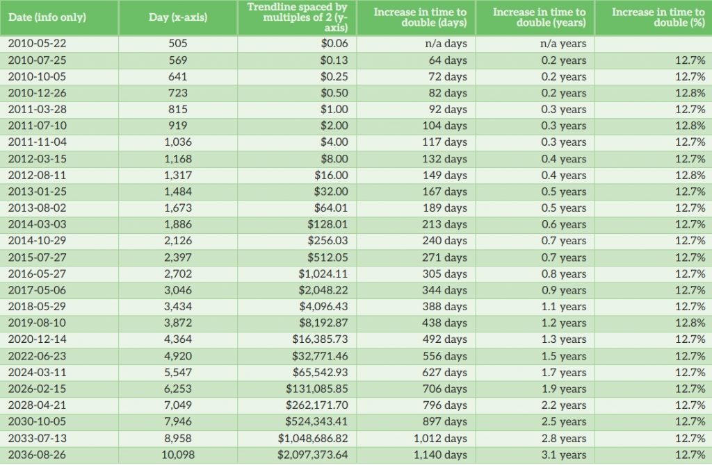 The following table shows how the Bitcoin price-time relationship manifests itself in a proportionate way. Each row in the table shows how long it takes for the trendline to double. If we then measure the increase in days that is reflected in each row, we find a proportional increase in time…see the Last column.